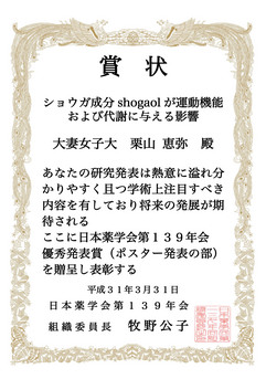 人間生活科学専攻 健康・栄養科学専修 栗山恵弥さん2019年3月20~23日に幕張で開催された「日本薬学会第139年会」で優秀発表賞を受賞しました。発表タイトルは「ショウガ成分shogaolが運動機能および代謝に与える影響」。ショウガの辛味成分の1つであるshogaolが骨格筋細胞に与える影響を調べ、shogaolには骨格筋のエネルギー代謝を活発にし、運動機能を高める効果がある可能性を示しました。